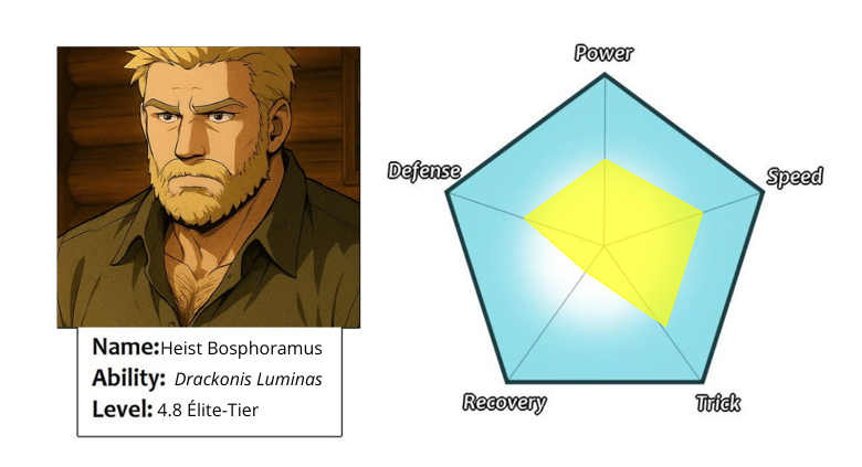 Son pouvoir, Drackonis Benedicta, symbolise ce double visage : la puissance solaire et draconique d’un guerrier ancien, mais aussi la lumière chaleureuse de celui qui veille, éclaire, et protège.